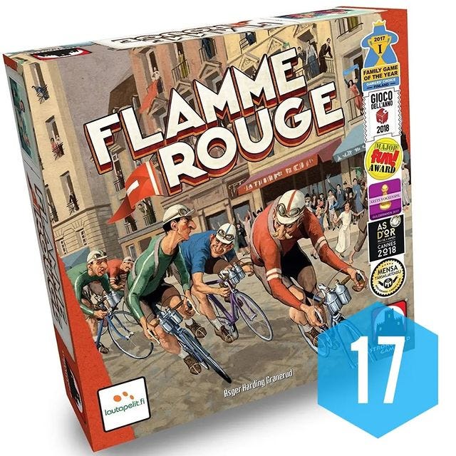 Uma simpática corrida de bicicletas onde a escolha das cartas é fundamental. Tente correr muito e ganhe cansaço (e cartas ruins) na etapa final. Tentar aproveitar o vácuo para ganhar posições e controlar dois ciclistas dão toda a graça no jogo. Por aqui, sempre jogamos com a expansão Meteo, com variações meteorológicas em alguns trechos da pista.