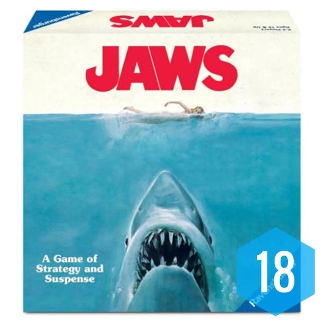 O jogo baseado no filme Tubarão é dividido em duas mecânicas. A primeira, de movimentação oculta, força os humanos a achar o predador (antes que ele devore muitos banhistas). A segunda é confronto puro no barco, um tentando matar o outro. Pela variedade e riqueza temática, Jaws sempre rende ótimas partidas.